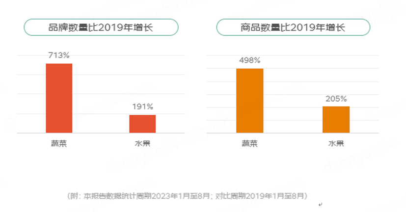 蔬菜、水果产业的品牌化趋势十分显著。在蔬菜品类中,出现了很多以产地为品牌的商品,如小汤山、坝上鲜蔬等,突出优质产地、生态种植、营养健康等特质。近5年,线上销售的蔬菜品牌数量增长713%,水果品牌数量增长191%。