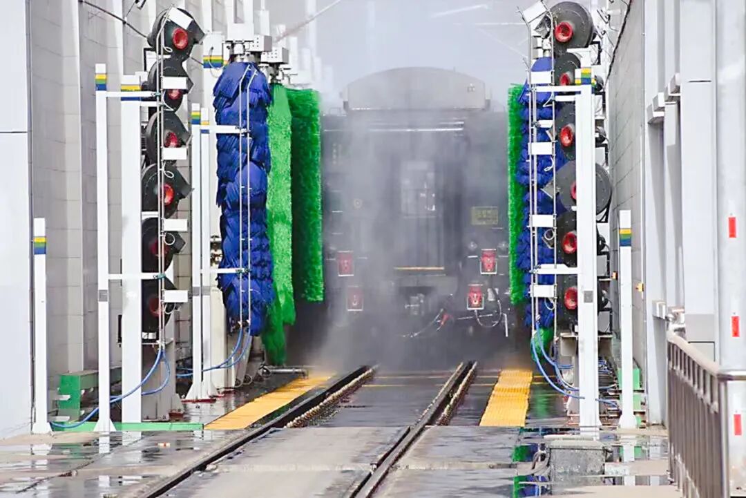 蘭州車両区間蘭州動力集中型列車作業場は、「緑の巨人」動力集中型高速列車16本の検査・修理・運営・メンテナンスを担当する。蘭州局集団公司は近年、技術イノベーションとインフラ高度化に力を入れており、昨年完成した初の全自動洗浄施設が正式に稼働している。その全長は36メートル、幅は6メートルで、機械洗車システム、噴水システム、制御システム、給水システム、水循環システム、測位検査システム、速度測定システム、監視システムが搭載されている。各洗車アームのブラシが列車表面との間隔を柔軟に調節でき、1台の自動洗車設備によって列車の両側、ルーフ、側面下部などの洗浄と乾燥を自動的に行える。