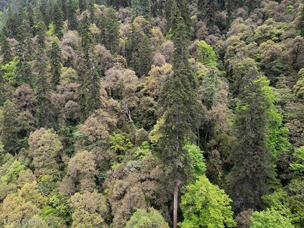 新たに発見された雲南黄果冷杉の森は、察隅県察隅河両岸の山地及び河谷地带に帯状に分布しており、標高は2300メートル前後。群落には国家1級重点保護野生植物の紅豆杉の古樹、それに着生するラン科やシダ類などの植物が数多くある。同エリアにこれほど高く大きい樹木の原生林が良い状態で残されているのは、主に優れた気候と地形条件、そして人類の活動が極めて少ないためだ。このエリアの大量の巨木、群落、生態系には重要な科学研究の価値と保護の意義がある。