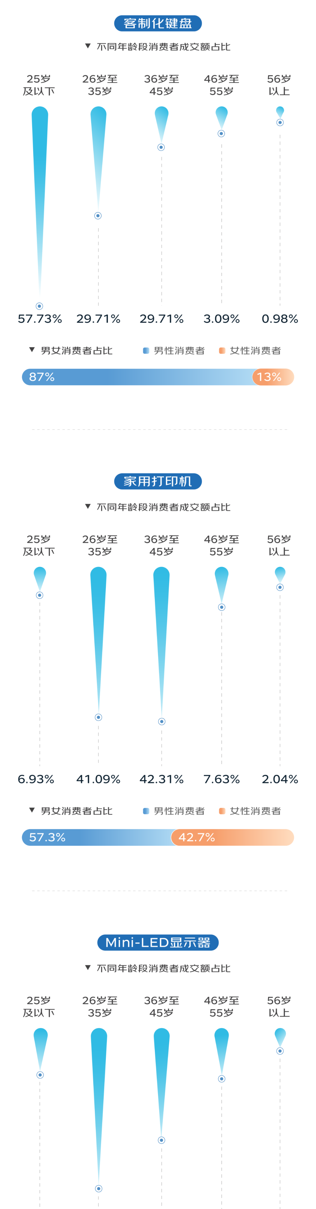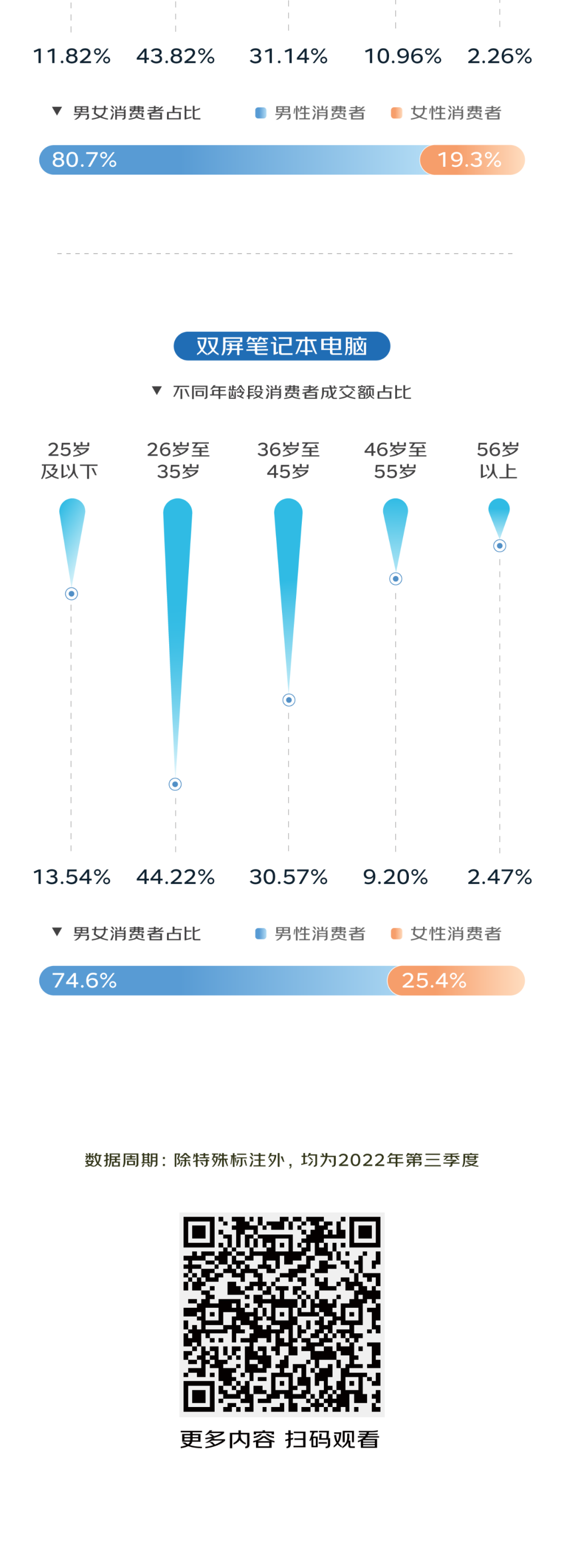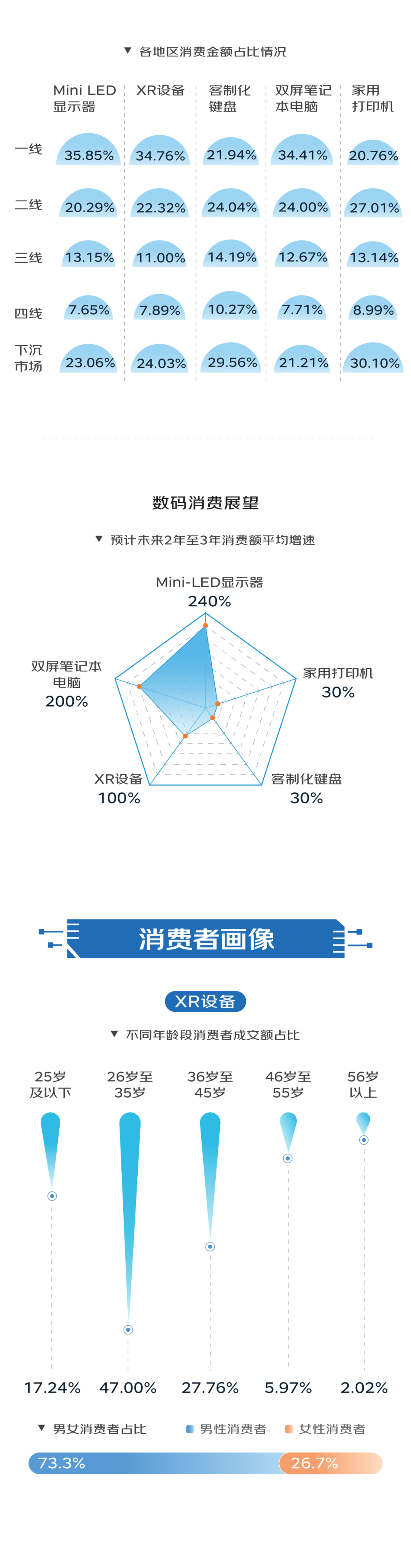 在数码消费热潮下,装备大墨盒、具有双面打印功能的家用打印机受到青睐,36岁至45岁消费者的需求尤为突出,展现出中青年消费群体对这一数码品类的强大消费潜力;具备高亮度、高对比度、高色彩表现的Mini-LED显示器品类,因能满足用户更高阶视觉需求受到广泛关注;聚焦工程师、设计师等群体日常工作需要的双屏笔记本电脑,则改变了笔记本电脑的传统使用体验,持续推动PC行业技术变革。
