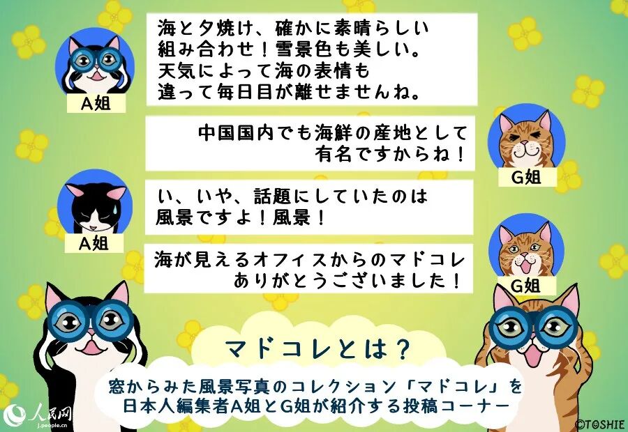 ウチのオフィスの窓からは、こんな風景またはこんなモノが見えると自慢していただく「マドコレ(窓から見た風景コレクション)」コーナー。どこまでも続く青い空や遠くに見える山々といった自然の風景から、オフィス街に建ち並ぶ高層ビルや幹線道路を走る車、庶民の暮らしが垣間見えるローカルな街並み、はたまた移動中の車窓からの眺めなどなど、高さや場所も異なれば、その窓から眺める風景も千差万別。中には仕事の意欲をアップさせてくれる元気の出る光景もあれば、疲れを癒してくれるほっこりした風景も。そんな皆さまからお寄せいただいたマドコレの数々を、毎週火曜日に、人民網日本人編集者のA姐とG姐がコメントしながら、のんびり紹介していきます。