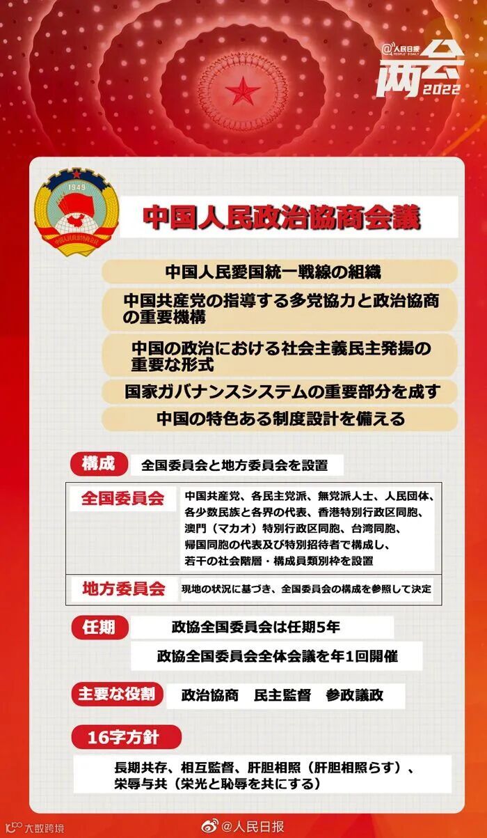 主要な役割:政治協商 民主監督 参政議政