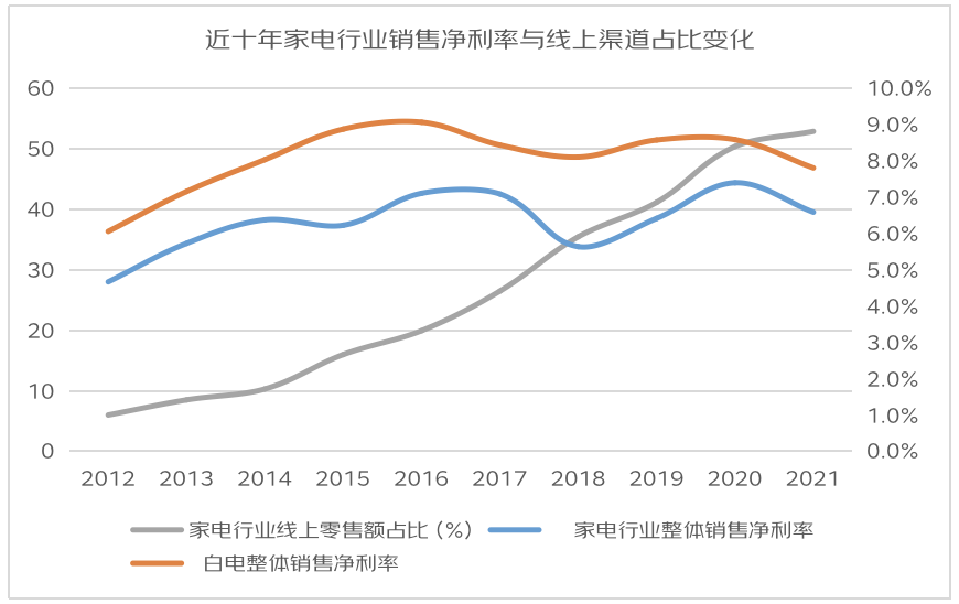 (图:近十年家电行业整体销售净利率与线上渠道占比呈正相关,数据来源:wind, 赛迪研究院)