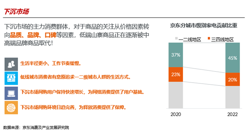与之相对比的是,到2022年三季度,京东家电购买人群中来自3-6线市场的比重已经高达65%,其中来自五六线地区的消费者更是成为增长的典型,贡献已经从2020年的37%提高到了45%,同比增长超20%,成为家电市场最具增长潜力的一极。