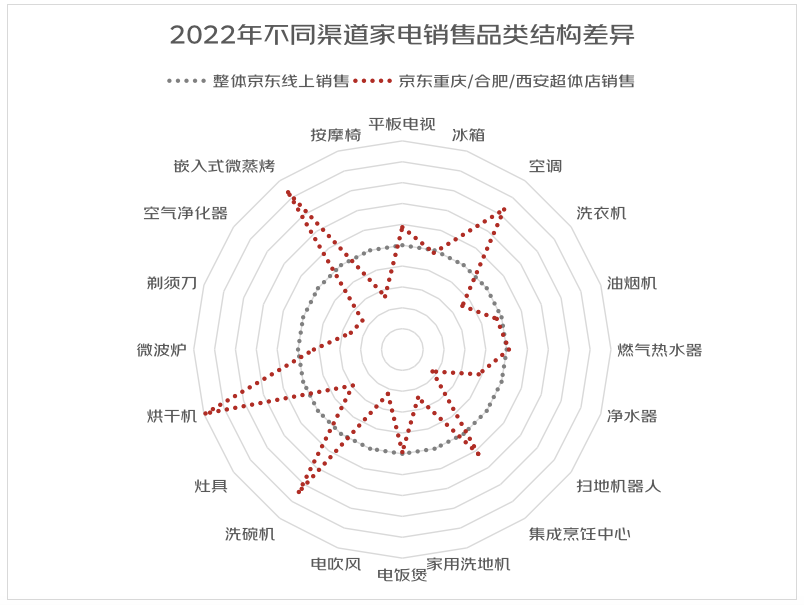 对比2022年京东家电整体线上消费与合肥、西安、重庆超体店消费(成交额)的结构差异可见,线下去超体店的消费者明显倾向于在亲身体验后购买空调、电视、烹饪中心等大件商品,而在现场的实际观感也推动了嵌入式微蒸烤、烘干机、洗碗机、集成烹饪中心新兴趋势品类的销售。可以说,身临其境的体验更可以拉近消费者与新品类的距离,激发购买欲望,从而推动趋势品类的渗透与下沉。
