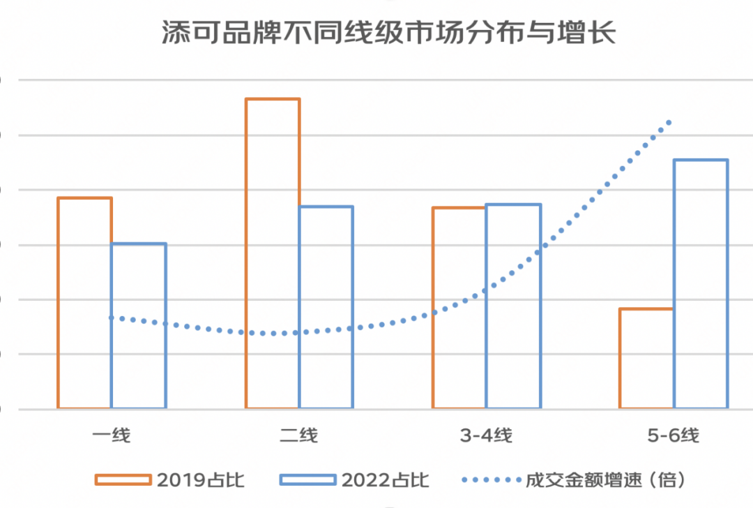 而另一个作为新兴品牌的添可(产品线包括洗地机、料理机和净水器等),其2022年在京东的成交金额同比2019年增长400多倍,其下沉市场贡献占比从19年的36%激增到55%。