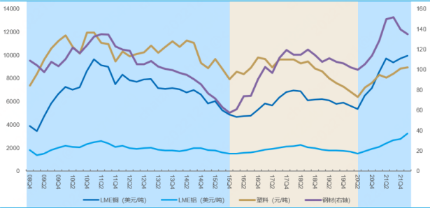 家电及核心部件产品的主要原材料为各种等级的铜材、钢材、铝材和塑料等,原材料成本占家电总成本比重高,因此,原材料价格的上升将会使家电企业成本端和利润率承压加大。数据显示,2016年以来,家电行业原材料价格整体处于上行趋势,这给家电企业的盈利能力和经营业绩带来较大的挑战。