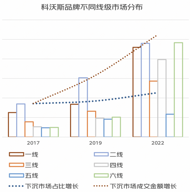从科沃斯品牌在5年中的增长来看,1-2线市场消费金额在5年中增长2倍左右,而低线尤其是6线市场增长近9倍,而且明显是从2019年之后下沉加速。在疫情期间全国供应链、物流受到一定影响的背景下,依然能将下沉市场成交额占比从2019年的43%提升到60%,成交额同比增长220%。