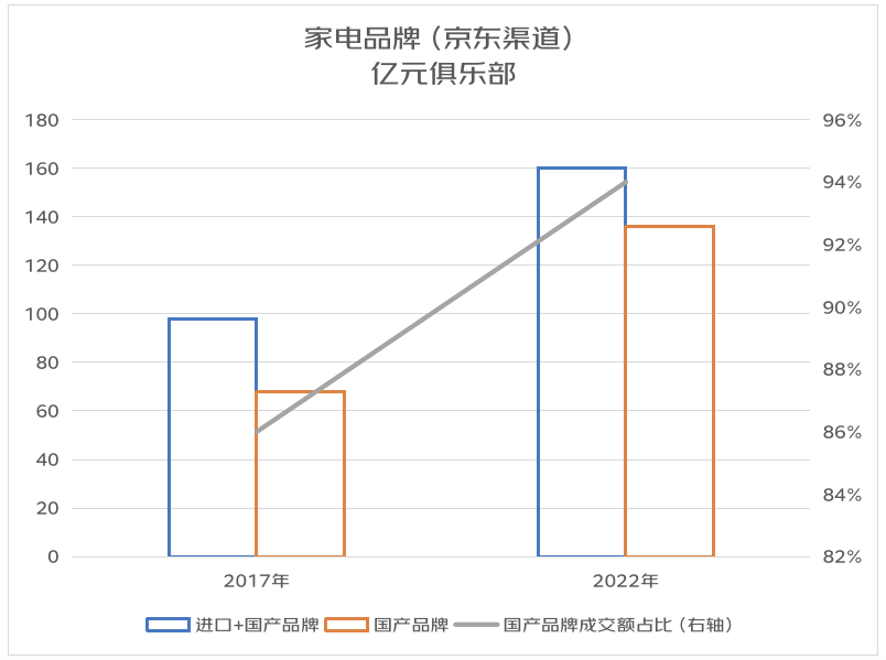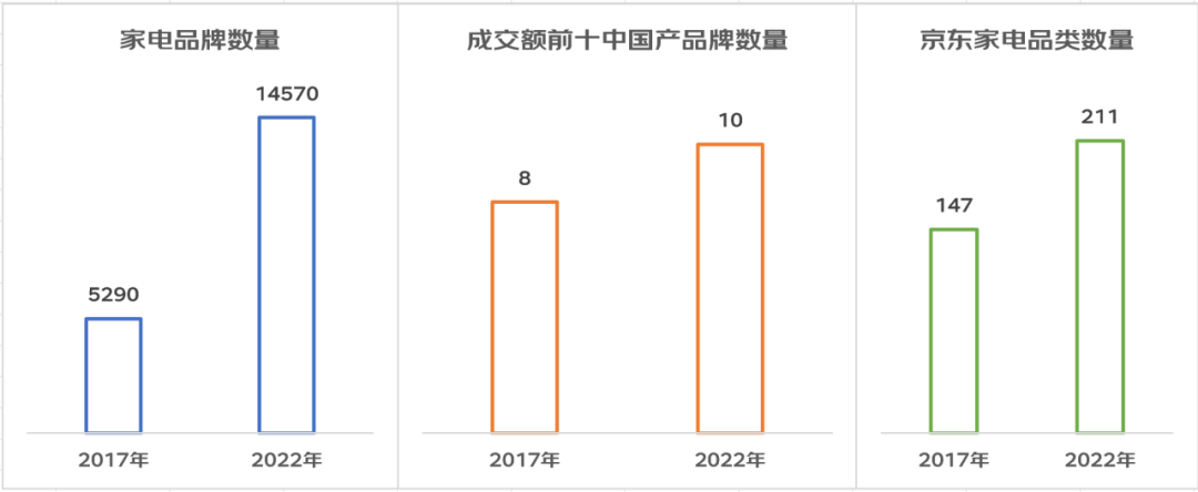 (图:近五年家电品牌及品类数量增长,国产品牌占比提升,数据来源:京东消费及产业发展研究院)