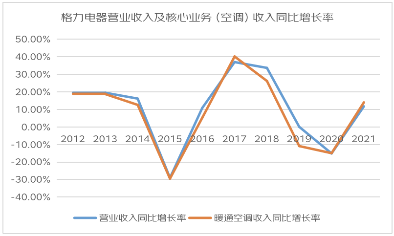 (图:近十年格力电器营业收入及核心业务收入同比增长率,数据来源:公司财报)