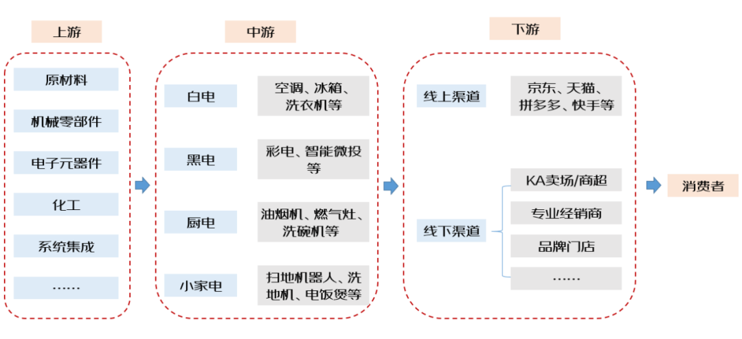 从产业链看,家电生产企业位于中游,上游为家电原材料和零部件生产商,下游为销售渠道和终端消费者。家电上游产业链涉及行业众多,主要包括电子、机械、电力设备、新能源、生产装备等上游制造业,以及化工、钢铁、有色金属等原材料。产业链中游即家电生产制造企业,其产品种类可主要分为白电、黑电、厨电及小家电。家电下游为销售渠道,按数字化属性可分为线上渠道和线下渠道。线上渠道主要包括京东等电商企业和抖音等直播平台,线下渠道主要包括KA卖场/商超、专业经销商、品牌专卖店等。