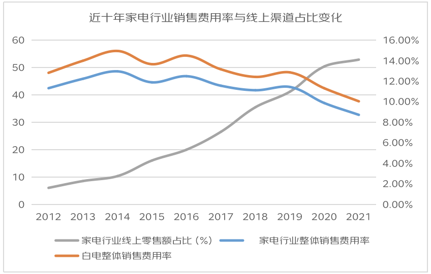 (图:近十年家电行业随着线上渠道占比提升,整体销售费用率下降,数据来源:wind, 赛迪研究院)