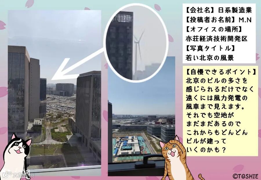 ウチのオフィスの窓からは、こんな風景またはこんなモノが見えると自慢していただく「マドコレ(窓から見た風景コレクション)」コーナー。どこまでも続く青い空や遠くに見える山々といった自然の風景から、オフィス街に建ち並ぶ高層ビルや幹線道路を走る車、庶民の暮らしが垣間見えるローカルな街並み、はたまた移動中の車窓からの眺めなどなど、高さや場所も異なれば、その窓から眺める風景も千差万別。中には仕事の意欲をアップさせてくれる元気の出る光景もあれば、疲れを癒してくれるほっこりした風景も。そんな皆さまからお寄せいただいたマドコレの数々を、毎週火曜日に、人民網日本人編集者のA姐とG姐がコメントしながら、のんびり紹介していきます。
