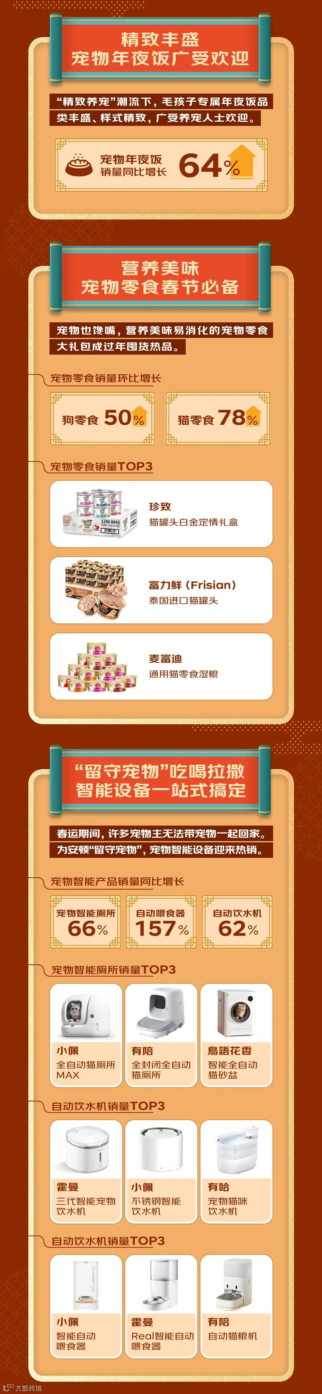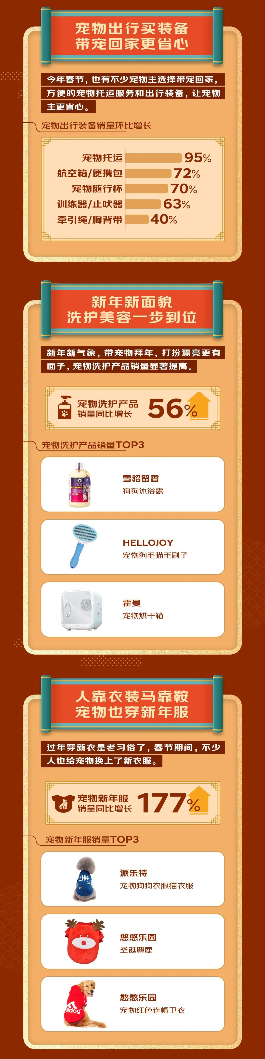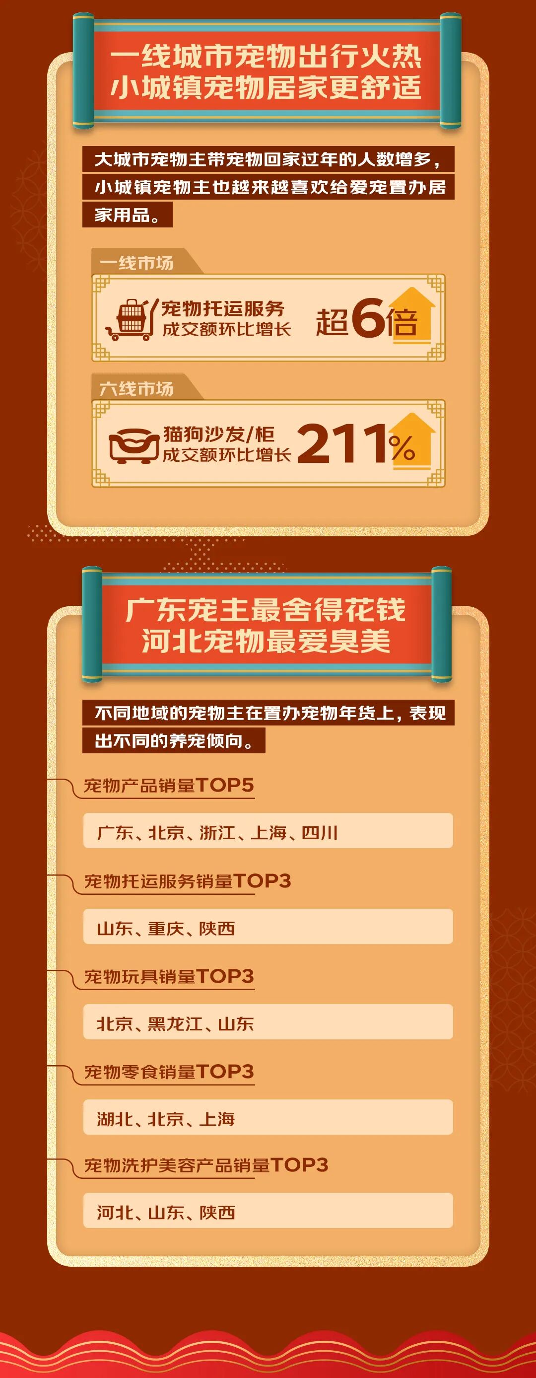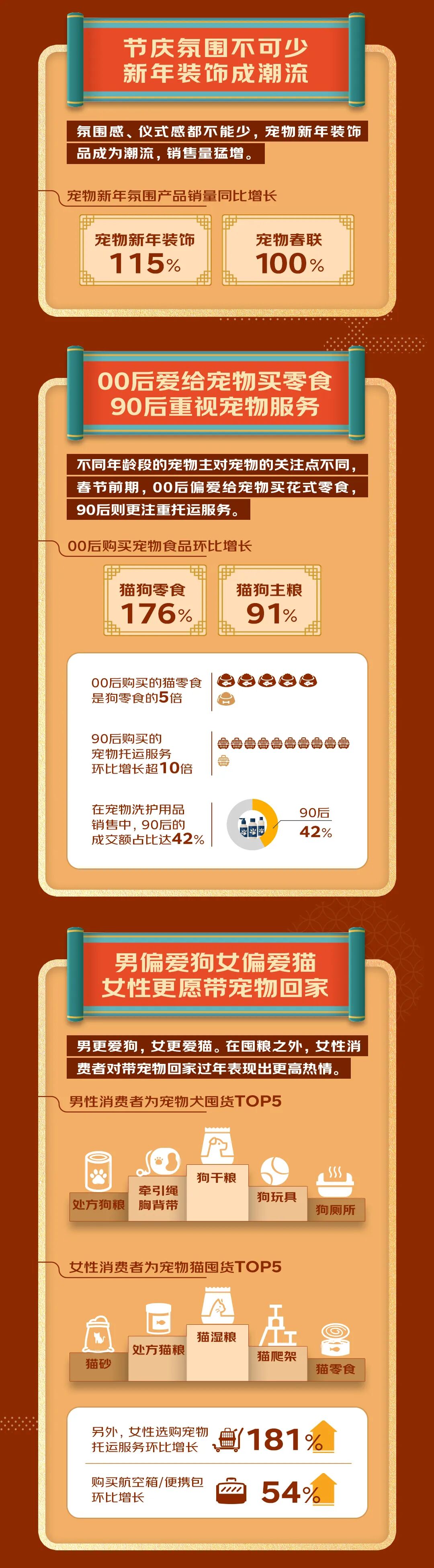 从整体上看,随着精致化养宠理念的深入,宠物年货市场向着更加多样化的方向发展:宠物主粮过年必囤、宠物年夜饭成新秀、宠物零食销量大增、宠物智能设备成关照“留守宠物”神器、宠物出行装备异军突起、宠物洗护产品销量创新高、宠物过年也爱穿新衣、宠物新年氛围产品热销、90后宠主消费比00后更成熟、男女各倾向给犬猫囤货、大城市宠物主带宠物回家过年人数增多、各地区偏爱的宠物产品种类迥异。