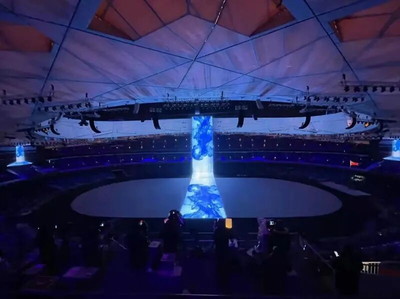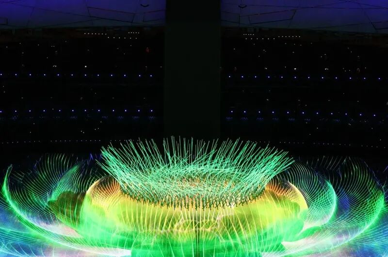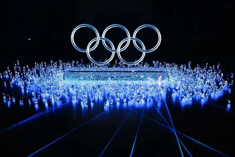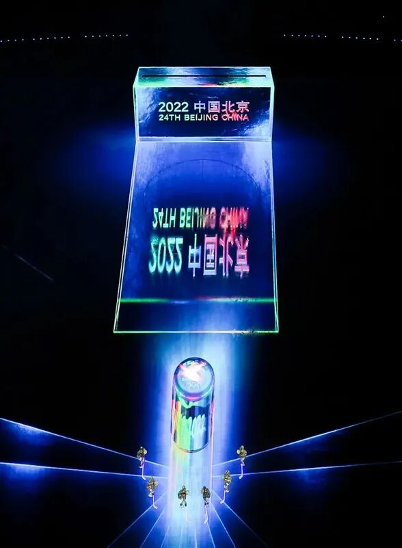 第24回冬季五輪を表わす24のレーザー光線が氷のような立方体を「彫刻」するかのごとく浮かび上がらせ、そこに過去23回の冬季五輪開催都市が次々に登場し、最後には「2022中国北京」の文字が現れた。