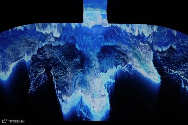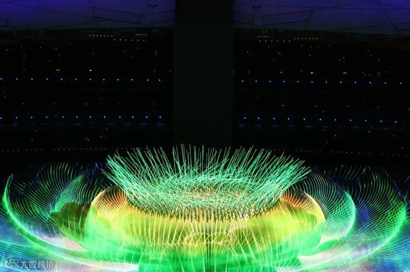 開会式の中で、1滴のアイスブルーの墨汁が空から落ち、幻想的に広がって黄河の水になり、とうとうと流れだし、まるで中国絵画を会場の地面に敷き詰めたようになった。李白の詩「黄河の水 天上より来たる」の世界が出現した。