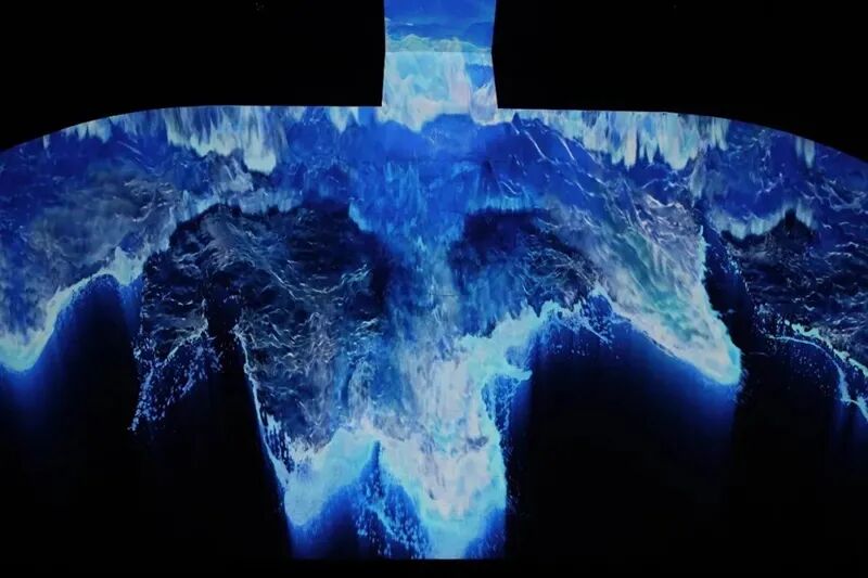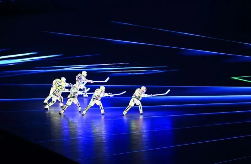 アイスホッケー選手が映像のパックを追いながら連動して動き、パックが「氷の立方体」に当たると、きらきらと光り輝く「氷の五輪マーク」が氷を砕いて立方体の中から浮かび上がった。
