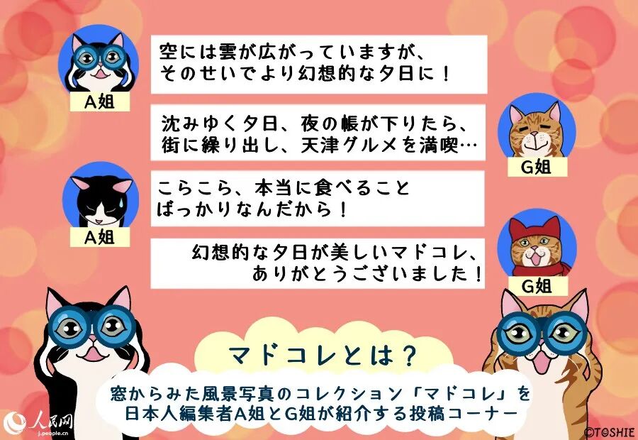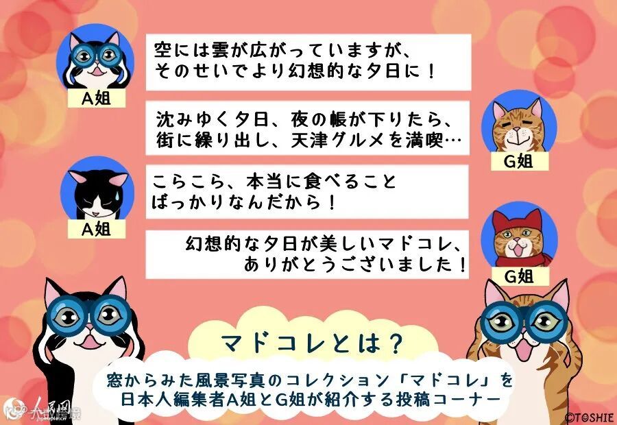 ウチのオフィスの窓からは、こんな風景またはこんなモノが見えると自慢していただく「マドコレ(窓から見た風景コレクション)」コーナー。どこまでも続く青い空や遠くに見える山々といった自然の風景から、オフィス街に建ち並ぶ高層ビルや幹線道路を走る車、庶民の暮らしが垣間見えるローカルな街並み、はたまた移動中の車窓からの眺めなどなど、高さや場所も異なれば、その窓から眺める風景も千差万別。中には仕事の意欲をアップさせてくれる元気の出る光景もあれば、疲れを癒してくれるほっこりした風景も。そんな皆さまからお寄せいただいたマドコレの数々を、毎週火曜日に、人民網日本人編集者のA姐とG姐がコメントしながら、のんびり紹介していきます。