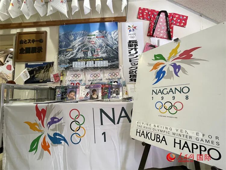 日本长野县白马村综合资料馆内展示的1998年日本长野冬奥会纪念品。人民网 吴颖摄