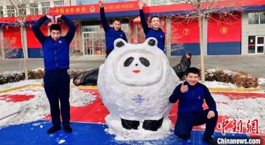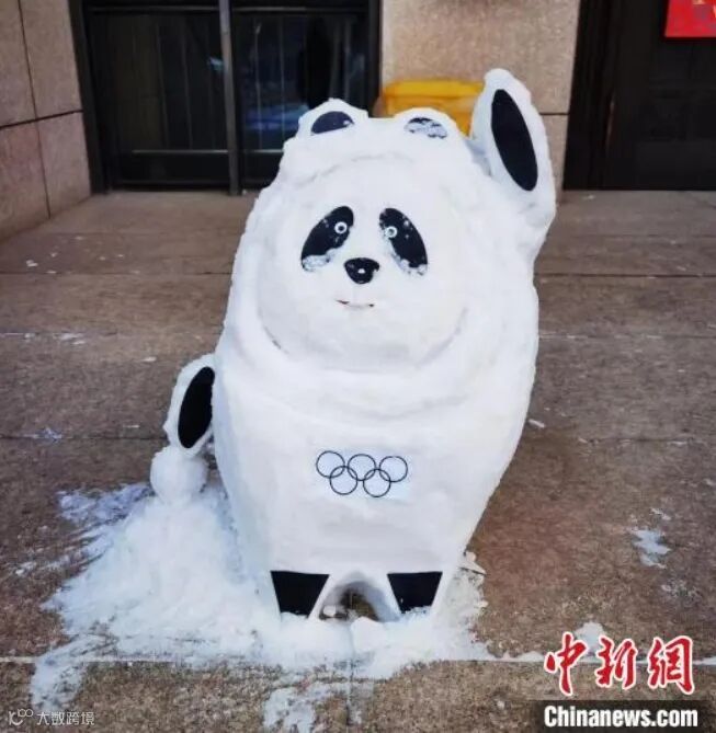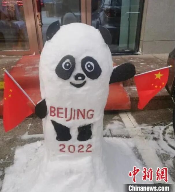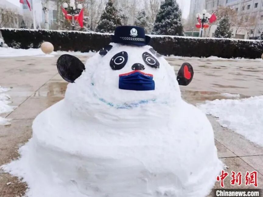 マスクに帽子まで被ったビン・ドゥンドゥン雪だるま。