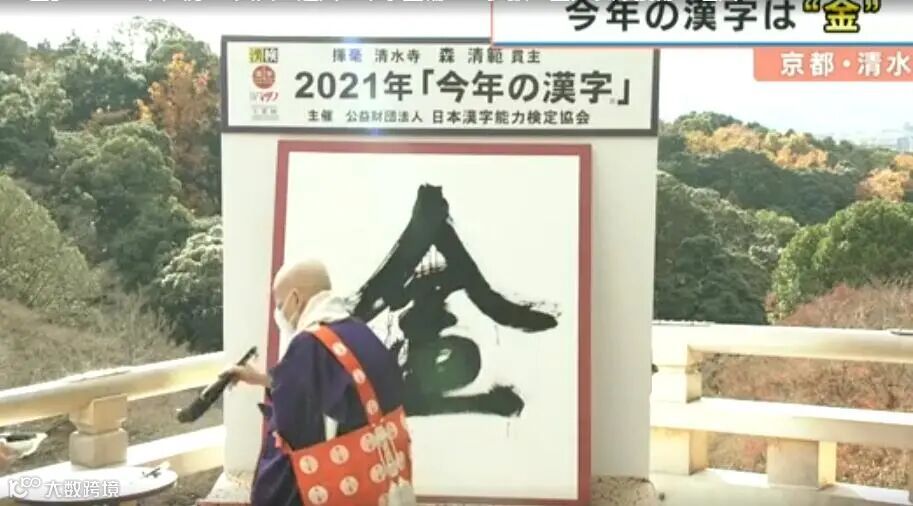 清水寺主持森清范挥毫将“金”字书写在长1.5米、宽1.3米的和纸上。(视频截图)
