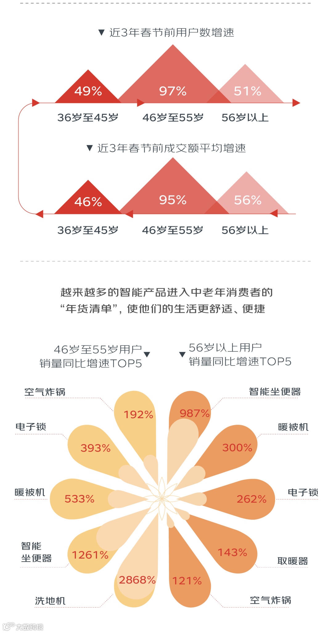 由于年龄、职业、性别等各有不同,消费者选购的年货往往大不相同。比如,年轻人喜欢在年前添置运动休闲用品,轻松快乐地过年;为人父母的中青年消费者替家人想得更多,要让全家都过个幸福年;中老年消费者则喜欢趁着过年买些新家具和装饰品,点亮家居生活。这些数据可以为生产者和销售者提供正向反馈,帮助他们在品类布局和投放节奏上更有针对性,实现更好的商业效果。