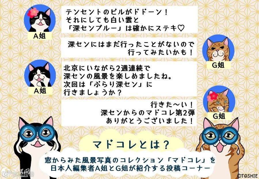 ウチのオフィスの窓からは、こんな風景またはこんなモノが見えると自慢していただく「マドコレ(窓から見た風景コレクション)」コーナー。どこまでも続く青い空や遠くに見える山々といった自然の風景から、オフィス街に建ち並ぶ高層ビルや幹線道路を走る車、庶民の暮らしが垣間見えるローカルな街並み、はたまた移動中の車窓からの眺めなどなど、高さや場所も異なれば、その窓から眺める風景も千差万別。中には仕事の意欲をアップさせてくれる元気の出る光景もあれば、疲れを癒してくれるほっこりした風景も。そんな皆さまからお寄せいただいたマドコレの数々を、毎週火曜日に、人民網日本人編集者のA姐とG姐がコメントしながら、のんびり紹介していきます。
