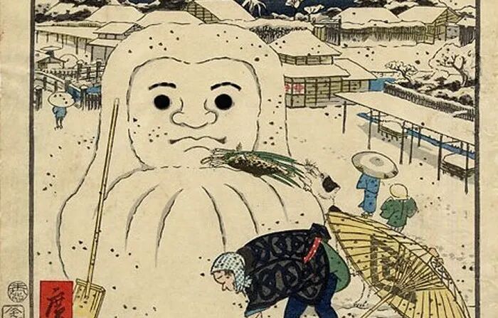 据说日本雪人的原型是达摩不倒翁。在日本,江户后期的绘画作品中就曾出现雪人,模样非常像日本的达摩不倒翁。此外,浮世绘画家歌川广景在《江户名所道戏尽》中,也描绘了面前摆放供品的雪人,和“不倒翁”一样,都是招福吉祥之物。