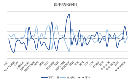 从集中度上看,下沉市场购书类目更为集中,童书、中小学教辅、考试类图书成交额占比达44%,比一线城市高30%(TGI);而高线市场阅读书籍的各类分散,下图可见不同线级市场的购书结构对比,总体上看,下沉市场波动更大,说明其偏好更加集中,也就是某类书消费很多,某些类书消费很少。