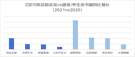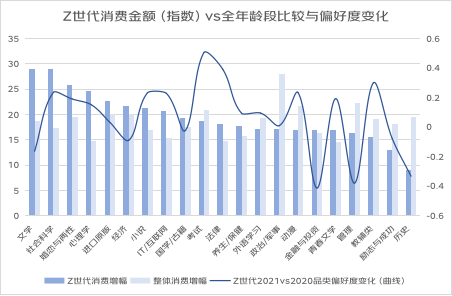 此外,Z世代在社会科学、哲学、心理学、艺术等人文领域,以及励志类书籍上基本与整体无大差异;但如果从消费金额增幅对比和偏好度变化来看,年轻人在婚恋、文学、心理学和小说类书籍上消费金额增幅都明显大于平均值。