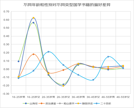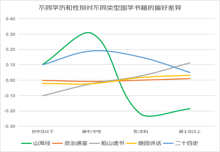 而从学历x性别曲线来看,总体上学历越高,对国学的偏好度呈上升趋势,其中《山海经》在较高学历人群中的热度相对较低,而诗话、历史类书籍的热度基本呈上升趋势。