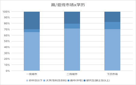 从上图可见,在二线城市、下沉市场中,高中及本专科学历的读者占比超过了一线城市中的比例,而一线城市的高学历(研究生)占比最高;说明在广大下沉市场中,民众对优秀文艺作品以及精神文化的需求非常迫切。