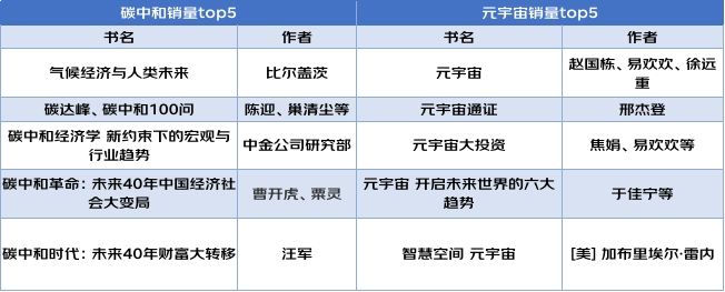 比如去年以来两个热词——“碳中和”、 “元宇宙”,成为经济类书籍销量前十名中的新面孔。