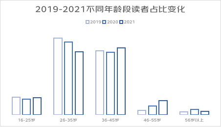 从年龄分布来看,35岁以下人群仍为阅读主力,占比超过50%,但是36-45岁这一年龄段人数占比迅速增加,高于比全站平均值15%。