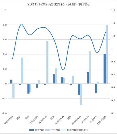 不过值得指出的是,两者间的一些差距正在变小。下图比较2021年与2020年占比变化可见,低线市场购买中小学教辅的占比明显下降。而自然、社会科学书籍的占比提升较快,同时经济、历史、外语、IT、政治/军事等类目书籍的占比都有增长;而客单价的增长,显示出下沉市场的用户也越来越倾向购买“大部头”、高质量、有价值的好书。