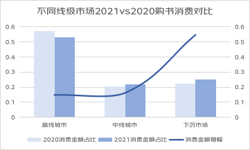 从线级分布来看,高线(1-2线)城市在购书投入的金额上仍占有优势,而下沉市场(5-6线)近年来增长很快,占比已高于中线城市(3-4线)。