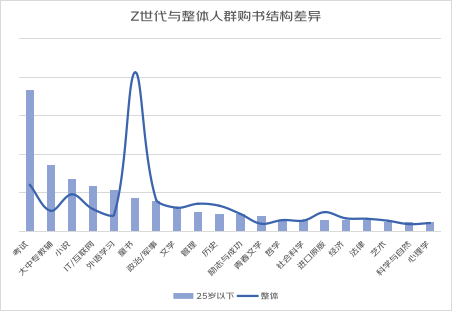 上图为25岁以下年轻人的购书消费结构与全部人群平均值的对比。可见,年轻人还是学习、考试类书籍上投入了大量阅读时间,同时他们一方面更爱阅读小说、青春文学等,一方面又在外语学习、IT与互联网等方面下功夫。