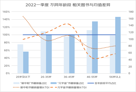 然而像“元宇宙”这样的新事物新名词,真的是年轻人在意的么?下图显示,相较于去年同期,2022年第一季度年轻人购买元宇宙相关书籍的数量同比增长180倍。26-35岁年龄段人群和36-45岁人群购买碳中和数据的热情增长最快。