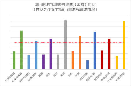 低线用户更倾向于购买考试、农林业等“实用书籍”,以及童书、小说、休闲娱乐、运动健身等书籍,而高线用户则在管理、经济、艺术、进口、IT技术等品类上领先。