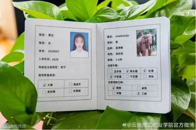 雲南省のある大学がこのほど入学手続きの際、一部の新入生に、「ゾウの運転免許証」を発行した。鮮やかなスカイブルーの冊子タイプの免許証を開くと、左側には運転者の情報が、右側にはゾウの情報が記載されている。そしてゾウにはそれぞれ、「焼包谷(バックスバニー)」や「小洋芋(ミニジャガイモ)」といった雲南にまつわるローカルネームが付けられている。