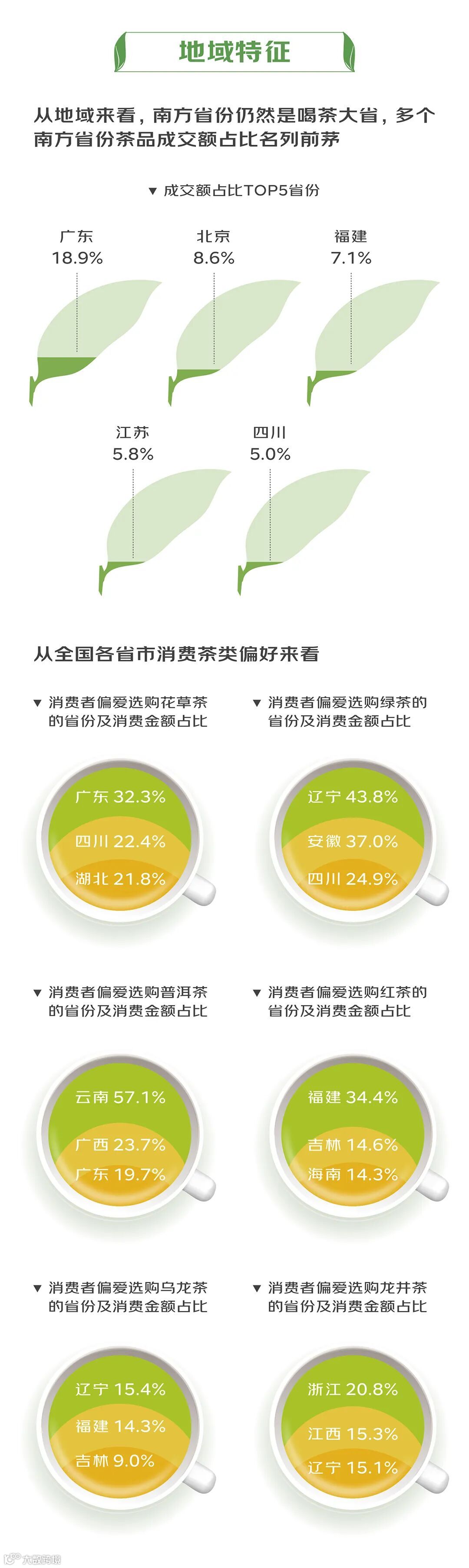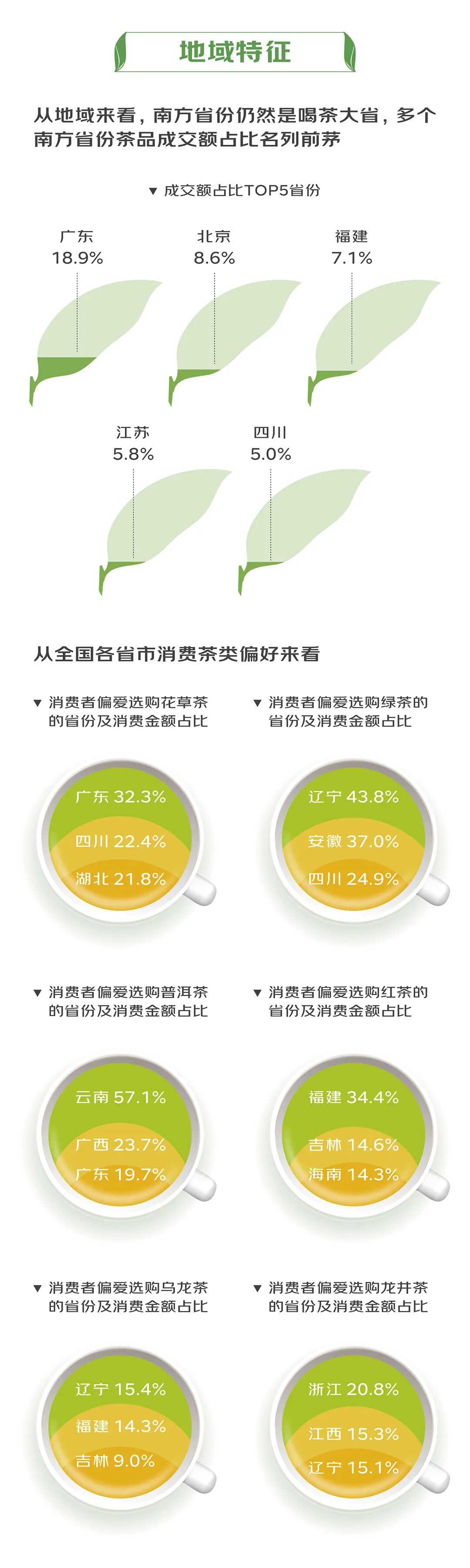 从地域茶消费的特征来看,南北方的饮茶偏好也大有不同。南方省份依然是饮茶大省,广东、福建、江苏、四川等多个南方省份茶品成交额占比名列前茅,这些地区的消费者更偏爱花草茶、普洱茶等;北方省份的消费者则更喜爱乌龙茶和龙井茶。