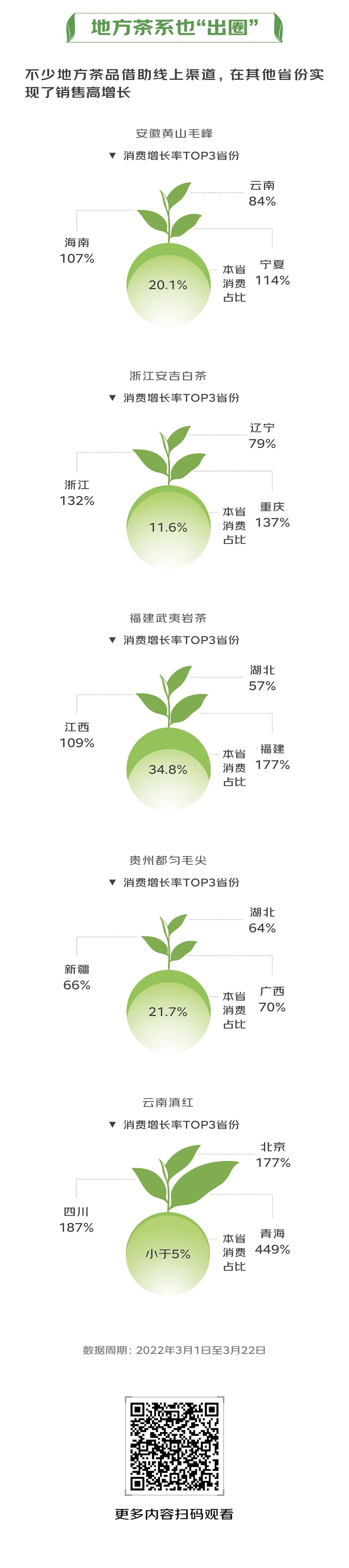 在消费升级的大背景下,区域特色茶品通过线上平台销售至全国各地,成为新风向,也逐步形成了地方茶系的“出圈效应”。以安徽黄山毛峰为例,安徽省本地的消费占比为20.1%,江苏、广东、上海等省份则成了黄山毛峰的消费大省,宁夏、海南、云南也有越来越多的消费者选购黄山毛峰。从全国各省份的成交额增速来看,越来越多的重庆消费者购买浙江安吉白茶、江西消费者购买福建武夷岩茶、广西消费者购买贵州都匀毛尖、青海消费者购买云南滇红等。电商企业不断助力高品质茶叶上行,助推地方茶产品进一步打破区域范围,实现了全国性的销售拓展。