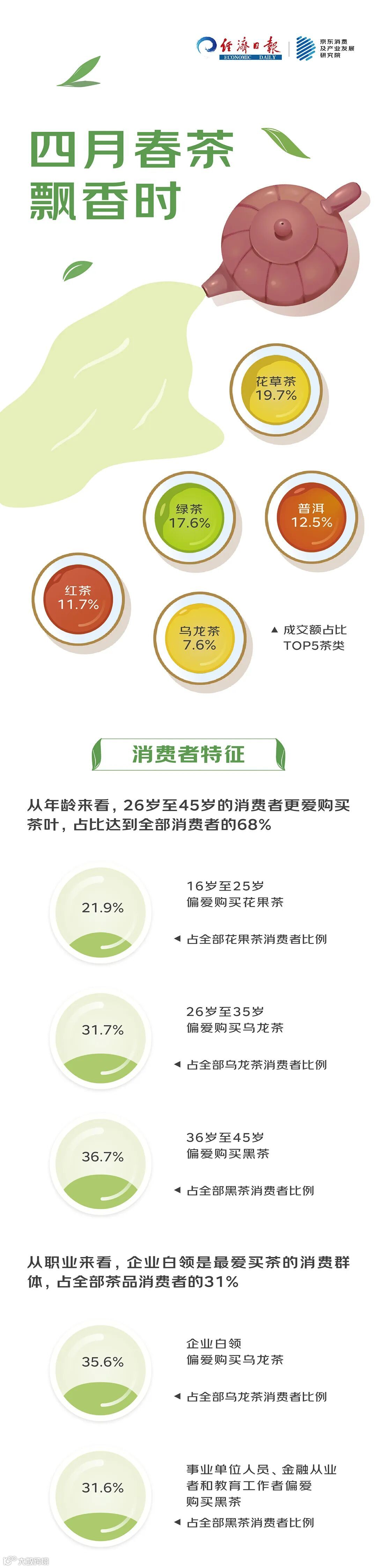 数据显示,消费者最爱购买的春茶为花草茶、绿茶、普洱茶、红茶和乌龙茶。但不同年龄段的消费者对茶的偏好有所不同。36岁至45岁成熟消费群体注重调理养生,偏爱购买黑茶;26岁至35岁的消费者更注重身材管理,偏爱购买乌龙茶;而16岁至25岁的年轻消费群体则更加注重美容养颜功效,选购了更多的花果茶。值得关注的是,今年3月销售增长最快的茶类也正是年轻一代更为喜爱的花果茶。茶企在做产品推广时应多注重“茶功效”和“茶文化”的输出,与不同消费群体产生情感沟通,提升市场需求。