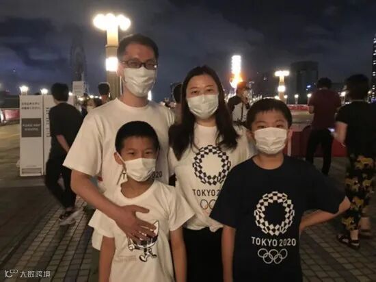居住在日本的中国家庭身着奥运纪念T恤,前往“梦之大桥”观看圣火台。李沐航摄