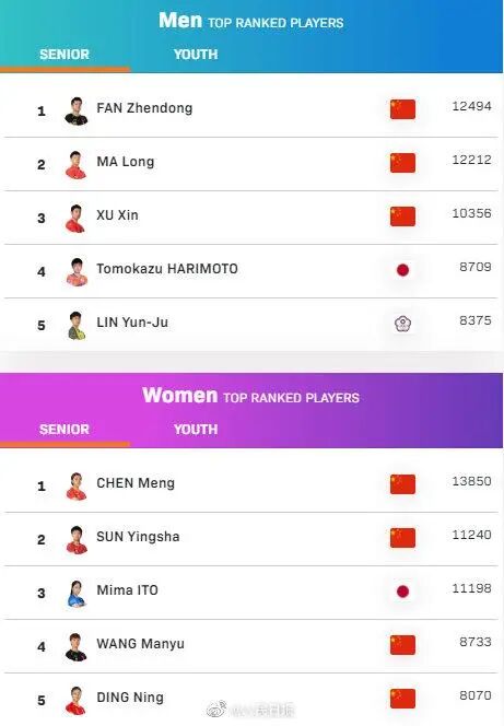 東京五輪が終わり、国際卓球連盟(ITTF)は最新の世界ランキングを発表した。男子では、樊振東・馬龍・許昕の各選手が1位から3位を占めた。東京五輪・卓球男子シングルスで優勝した馬龍選手は、ランキングを2位に上げた。女子では、陳夢選手が引き続きトップの座を守り、東京五輪で伊藤美誠選手に2度勝利した孫穎莎選手が2位に上がり、伊藤選手は3位に落ちた。王曼昱選手は4位。