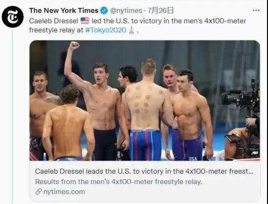 7月26日の東京五輪の競泳男子4×100メートルリレー決勝では、米国チームが3分8秒97で優勝したが、目ざといネットユーザーが見つけたのは、米国選手の背中いっぱいの「カッピング(吸い玉療法)痕」だった。