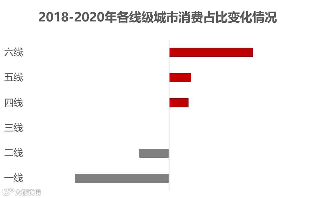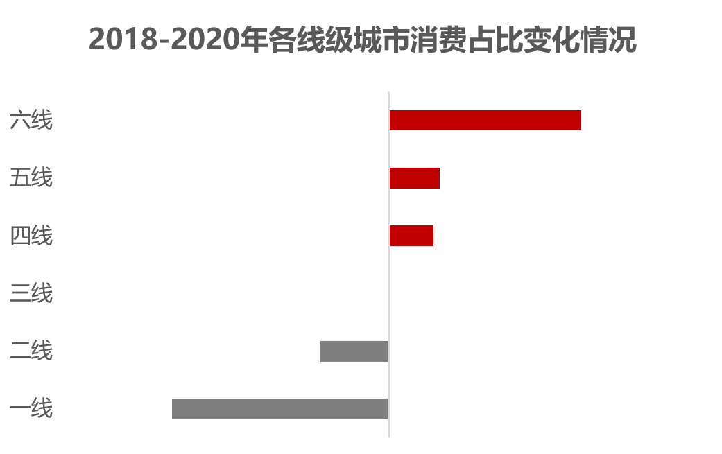 2020年,尽管受到疫情影响,下沉市场依旧释放出更强的消费动能。从各市场等级三年消费占比变化情况来看,四-六线市场的占比得到明显提升,一线、二线市场的保有量高,消费占比下降。