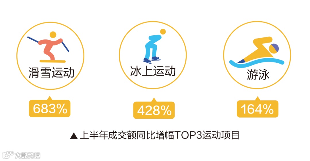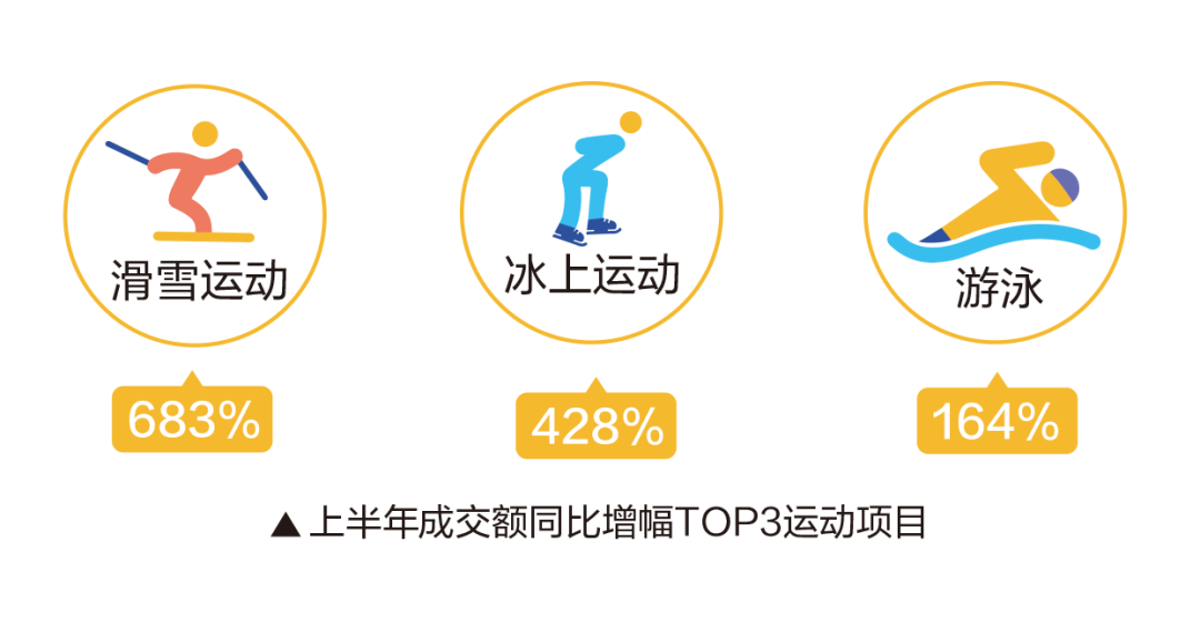 喜爱的运动健儿们实在太棒,除了为他们激情呐喊,还要把同款装备买买好。什么运动的相关消费正在快速增长?京东大数据显示,上半年成交额同比增幅TOP3运动项目分别是滑雪运动、冰上运动和游泳。