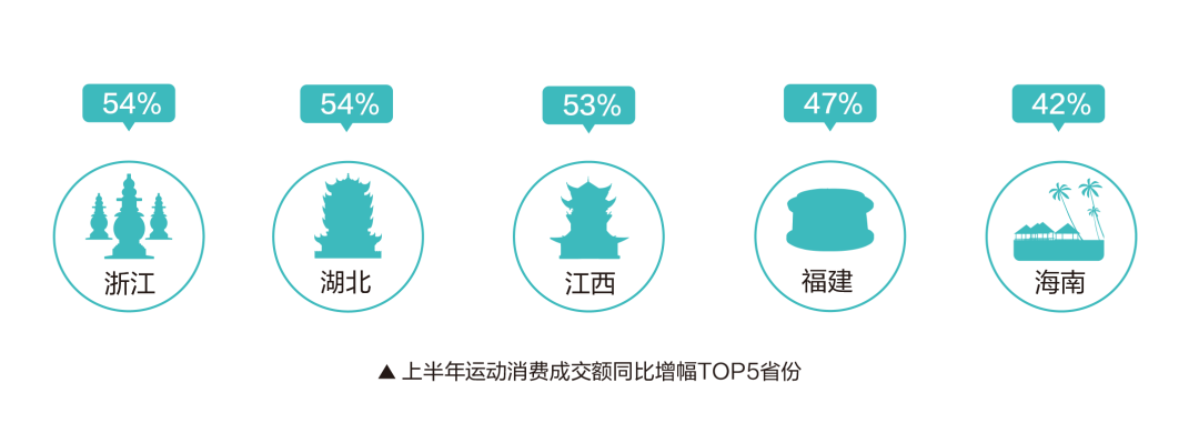 放眼全国各地,哪些城市的消费者,对哪些运动装备有着更大的消费热情呢?京东大数据显示,上半年运动消费成交额同比增幅TOP5省份分别是浙江、湖北、江西、福建和海南,这一波,南方朋友们相当给力。