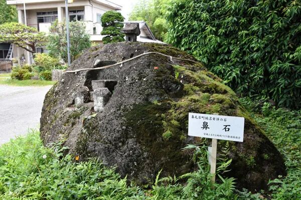 在丁字路口向东300米左右的地方有一块系有注连绳的石头。这块石头高约1.5米,周长约10米,旁边一块木牌上写着“鼻毛石町地名发祥之石 鼻石”。